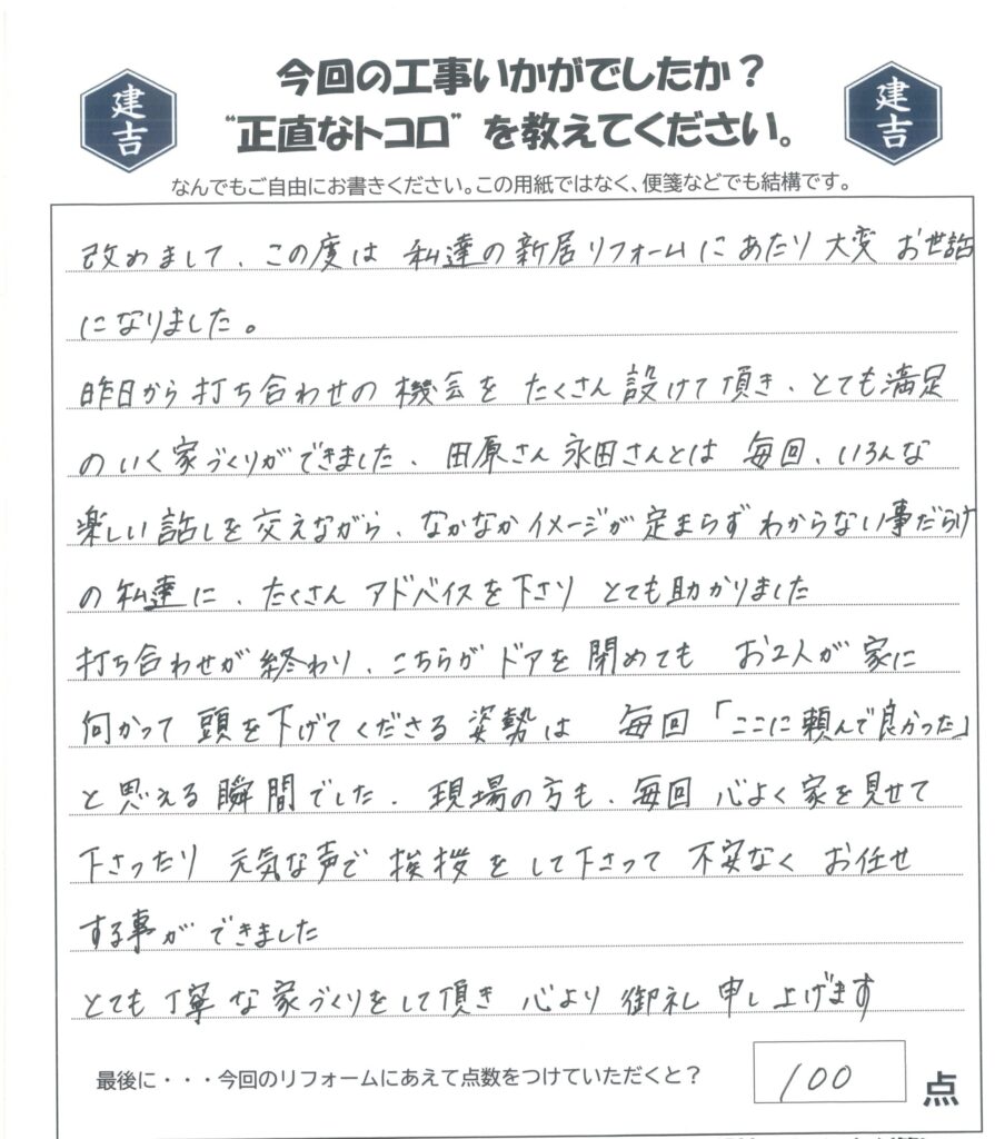 とても丁寧な家づくりをして頂き心より御礼申し上げます。